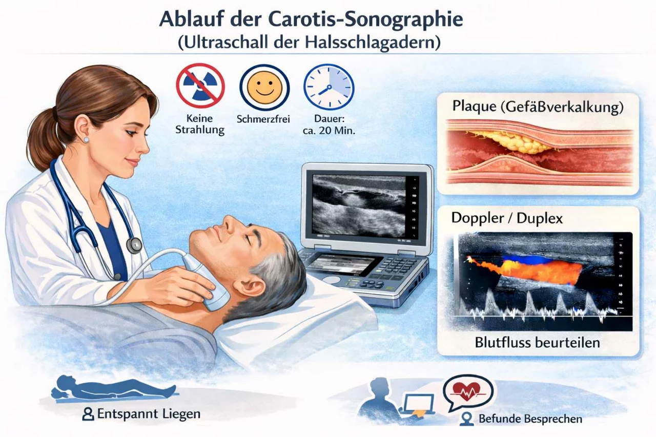 Mit einer schmerzfreien Ultraschalluntersuchung werden die Carotis-Halsschlagadern beidseits untersucht. Dabei wird insbesondere nach Gefäßverkalkungen (Plaques) systematisch gesucht und die Gefäßwanddicke (Intima-Media-Dicke) an mehreren Gefäßabschnitten gemessen. Eine Verdickung dieser Gefäßschicht kann ein früher Hinweis auf beginnende Atherosklerose (Gefäßverkalkung) sein.